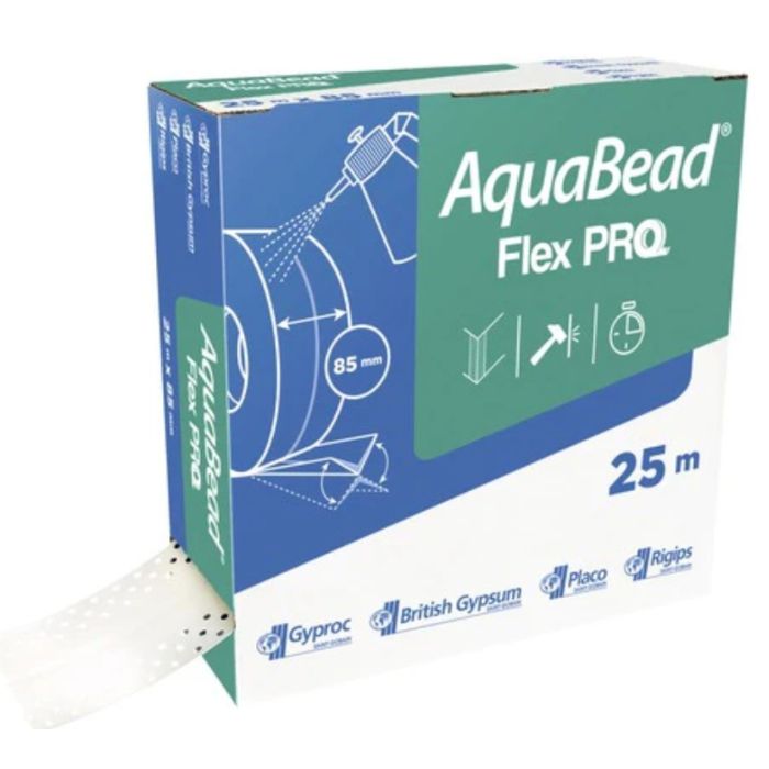 Kestävä kulmiin kohdistuvia iskuja vastaan. AquaBead Flex PRO kiinnitetään kostuttamalla nauhan takana oleva liimapinta ennen asennusta, lopullinen kiinnittäminen tapahtuu valmistasoitteella. Rullan leveys 86 mm, pituus 25 m.