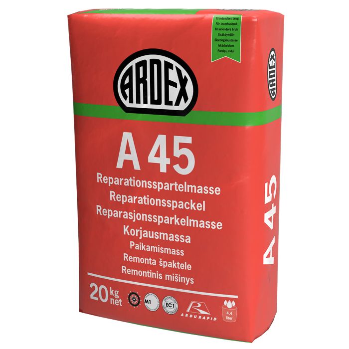 ARDEX A 45 on pastamainen korjausmassa sisätiloissa reikien paikkauksiin ja täyttöihin sekä epätasaisuuksien oikaisuihin erilaisilla betonialustoilla. Soveltuu porraskulmien ja tasojen korjauksiin ja tasoituksiin. Käy myös 2-komponenttipinnoitteiden ja liimattavien parkettien alle. Kovettuu ja kuivuu nopeasti myös suurissa kerrospaksuuksissa.