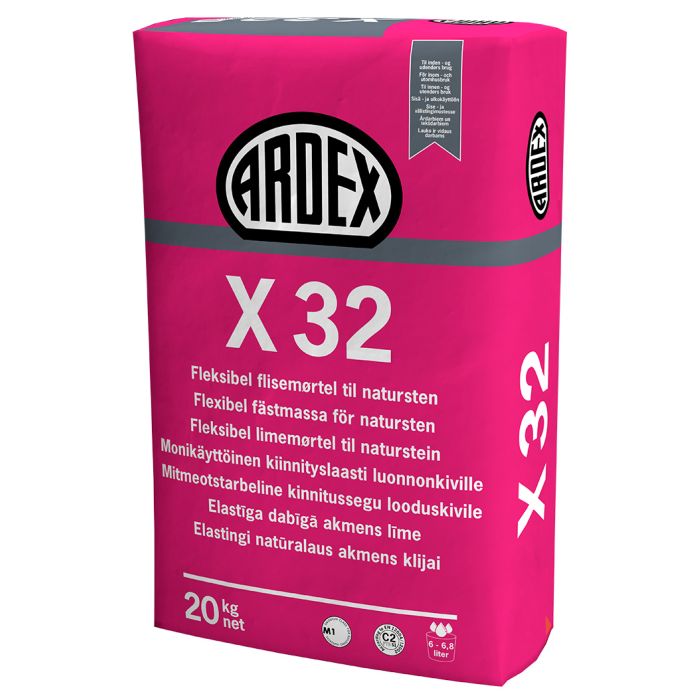 ARDEX X 32 on harmaa, veden- ja pakkasenkestävä kiinnityslaasti ulko- ja sisätiloihin. Voidaan käyttää kiinnittämiseen usealla eri laastipaksuudella. Ei värjää eikä aiheuta kalkkivärjäytymiä luonnonkivilaatoille tai betonilaatoille. Soveltuu myös seinä- ja lattiapintojen oikaisuun.