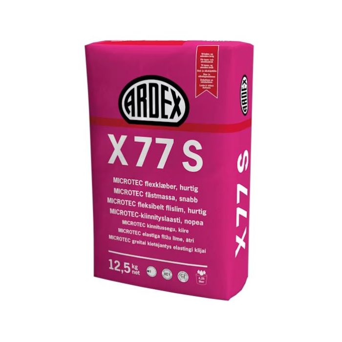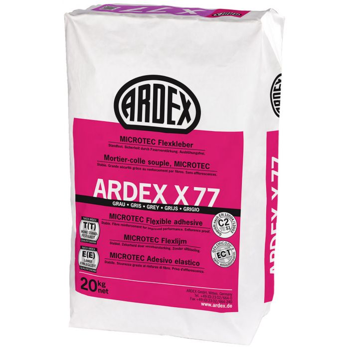 ARDEX X 77 on muodonmuutoskykyinen kiinnityslaasti ulko- ja sisätiloissa lattioilla ja seinillä. Voidaan käyttää uima-altaissa ja julkisivuilla tiiviille keraamisille laatoille, posliinimosaiikeille, betonilaatoille ja alkalista kosteutta kestäville luonnonkiville. Soveltuu myös laattojen asentamiseen vielä kutistuvilla betonipinnoilla, kun massiivinen betonirakenne on kuivunut hyvissä olosuhteissa vähintään kolme kuukautta.