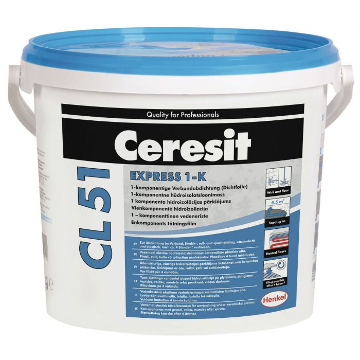 Töiden kulku.Vahvista seinän ja lattian rajakohdat, kulmat, liikuntasaumat yms. Ceresit CL 89/CL152- tai Ceresit CL252/CL62 – tiivistysnauhalla. Tiivistysnauha painetaan lastalla tiiviisti tuoreeseen CL 51 -kerrokseen, ja nauhan päälle levitetään toinen kerros. Nurkissa käytettävä CL 86 / CL 87 – nurkkakappaleita. Putkiläpivientien ja lattiakaivojen liitoksissa käytetään Ceresit CL 83 / CL 525 – vahvistuskappaleita. Vedeneristävyyden varmistamiseksi kerroksen kuivakalvon paksuuden on oltava vähintään 0,5 mm. Levitä ensimmäinen CL 51 kerros alustaan, ja toinen kerros noin 2 tunnin kuluttua ristikkäin ensimmäisen kerroksen päälle. Laatoituksen voi aloittaa noin 4 tunnin kuluttua toisen kerroksen kuivuttua. Laattojen kiinnitys tehdään esim.CM 49, CM 90, CM 17, CM 12 tai CM 14 kiinnityslaasteilla.