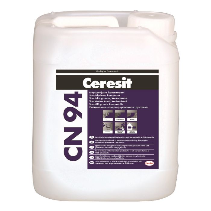 Ceresit CN 94 on suunniteltu alustojen pohjustukseen sisä- ja ulkotiloissa ennen lattiatasoitteen, paikkauslaastien sekä keraamisten- ja kivilaattojen kiinnityslaastin levittämistä.