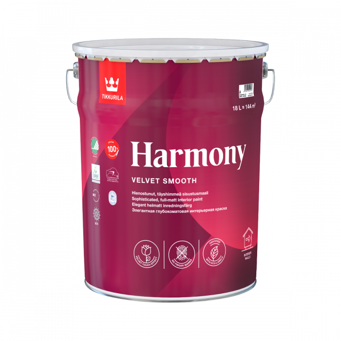 Harmony-sisustusmaalilla luot hienostunutta, sametinhimmeää pintaa olohuoneen ja makuuhuoneen seiniin ja kattoihin. Täyshimmeä Harmony häivyttää pinnan pienet epätasaisuudet. Vahvatkin värit toistuvat pehmeinä ja syvinä.