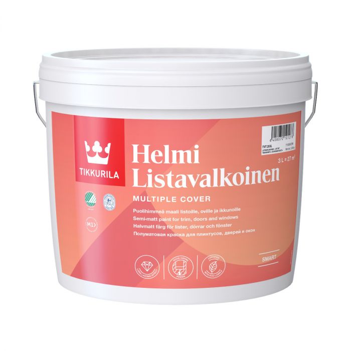 Helmi Listavalkoinen on turvallinen Joutsenmerkitty maali, joka kestää kulutusta.