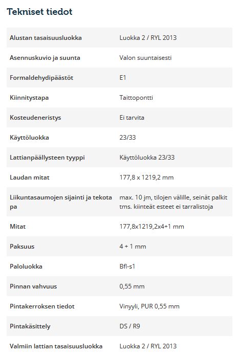 SPC runkoinen, nykyaikainen kivivinyylilattia kestää hyvin kovaa kulutusta, sekä kosteutta kodin ja julkisten tilojen kuivissa tiloissa. Lankuissa askeläänen vaimennus integroituna (19 dB). Asennetaan lattiaan taittopontilla. Ftalaattivapaa, alittaa VOC päästöarvot. Päästöluokka M1