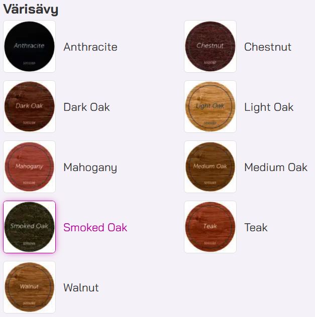 Sävyjä voi sekoittaa keskenään tai ohentaa spriillä oikean sävyn aikaansaamiseksi. Tummemman lopputuloksen aikaansaamiseksi tarvitset kaksi petsikerrosta. Tee koesively huomaamattomaan kohtaan varmistaaksesi värin sopivuuden sekä toivotun lopputuloksen. Lämpötilan tulee olla käsiteltäessä ja kuivuessa yli +10°C.