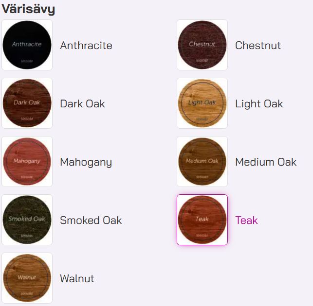 Sävyjä voi sekoittaa keskenään tai ohentaa spriillä oikean sävyn aikaansaamiseksi. Tummemman lopputuloksen aikaansaamiseksi tarvitset kaksi petsikerrosta. Tee koesively huomaamattomaan kohtaan varmistaaksesi värin sopivuuden sekä toivotun lopputuloksen. Lämpötilan tulee olla käsiteltäessä ja kuivuessa yli +10°C.