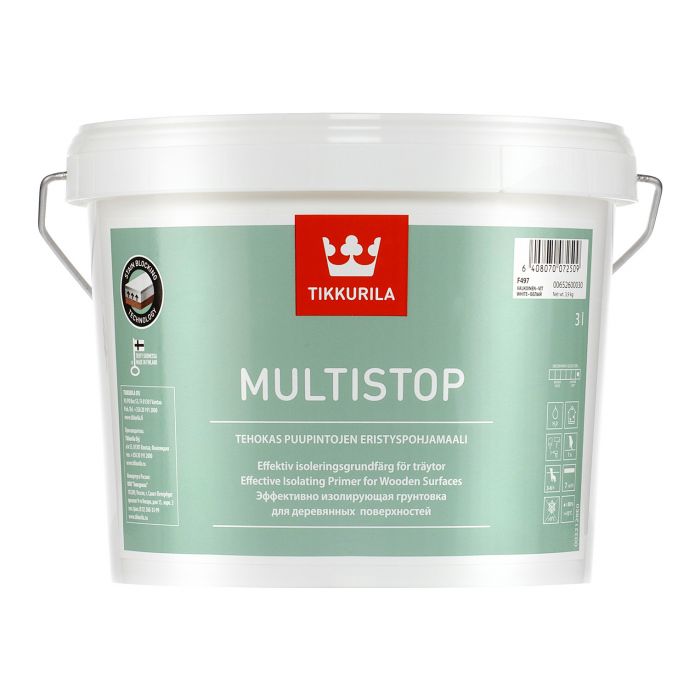 Multistop torjuu oksakohtien ja muiden tummentumien läpilyönnit, sekä peittää kellastuneen ja tummentuneen vanhan puupinnan. Erityinen teknologia sitoo puun uuteaineet pohjamaalikerrokseen, jolloin pintamaali jää puhtaaksi.