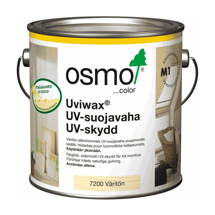 Osmo Color Uviwax UV-suojavaha pitää puupinnan kauniin vaaleana pitkään. Tehokkaan UV-suojan ansiosta Osmo Color Uviwax suojaa puupintaa auringon kellastavaa ja tummentavaa vaikutusta vastaan säilyttäen puun värisävyn luonnollisen vaaleana tai kuultovalkoisena.