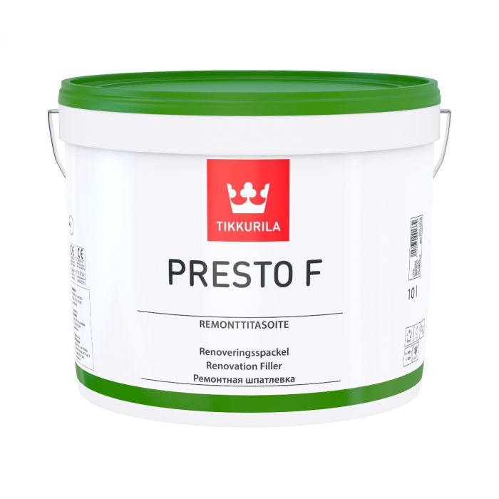 Presto F remonttitasoitteella pärjää niin pienien kolojen kittaamisessa kuin suuremmissa seinien osa- ja kokotasoituksissa. Se soveltuu myös saumanauhatyöhön, uusille levypinnoille ja vanhoille maalatuille pinnoille korjauskohteisiin.