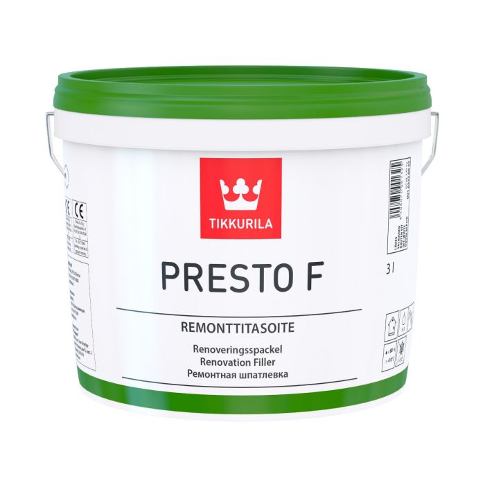Presto F remonttitasoitteella pärjäät mainiosti niin pienien kolojen kittaamisessa kuin suuremmissa seinien osa- ja kokotasoituksissa. Sen täyttökyky on 4 mm ja väri lähes valkoinen.