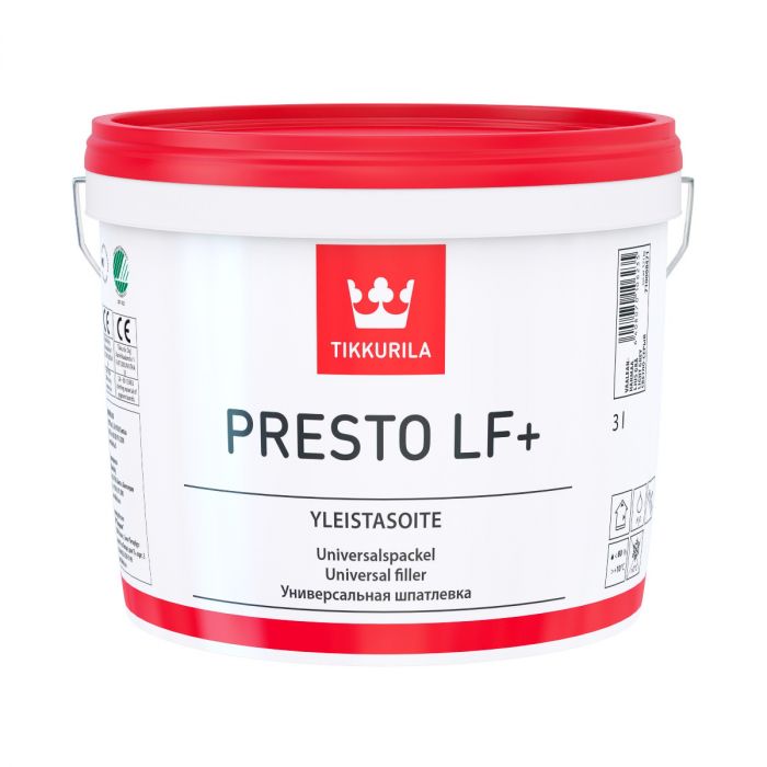 Presto LF+ Yleistasoite on käyttövalmista, ei vaadi erillistä sekoitustyötä ja on tasalaatuista purkista toiseen. Tuote on kevyttä levittää ja helppo hioa. Saat entistä helpommin tasainen alustan maalausta varten.