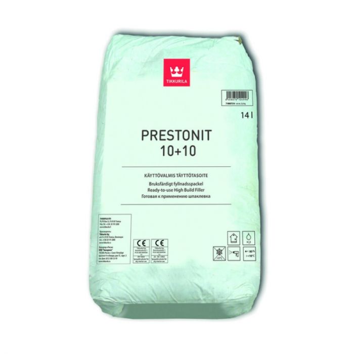 Levitä Prestonit 10 + 10 tasoiteruiskulla. Tasoitetta levitetään vain tarvittava määrä 0-10 mm. Tasoitteen annetaan hetki olla ennen pinnan tasoitusta teräslastalla. Näin saavutetaan paras täyttökyky. Tasoite soveltuu myös käsin levitykseen. Tasainen lopputulos ei vaadi tasaisen paksua tasoitekerrosta. Alustan epätasaisuudesta riippuen tasoitekerroksen paksuus voi vaihdella 0 - 10 mm. Tasoitekerroksen kuivuttua pinta hiotaan. Tasoituskertojen lukumäärä normaalisti 1-2 kertaa. Tasoitettu pinta voidaan maalata, kaakeloida tai päällystää muovitapetilla. Kattopinnoilla voidaan jättää ruiskutasoitepinnalle sellaisenaan.