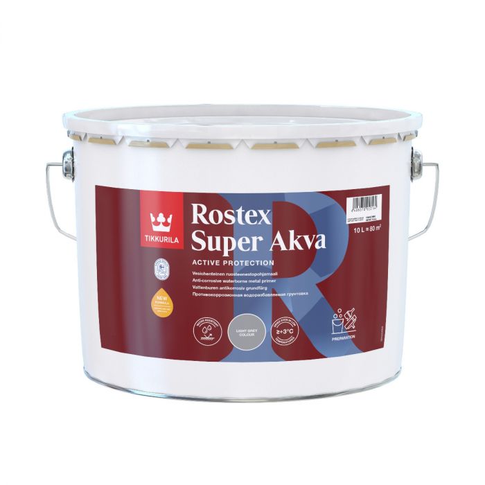 Rostex Super Akvalla pohjamaalaat peltikatot, syöksytorvet, suojapellit ja muut metallipinnat ulkona. Vesiohenteinen tuote soveltuu mainiosti myös sisäkäyttöön, esimerkiksi lämpöpattereiden pohjamaalaamiseen.