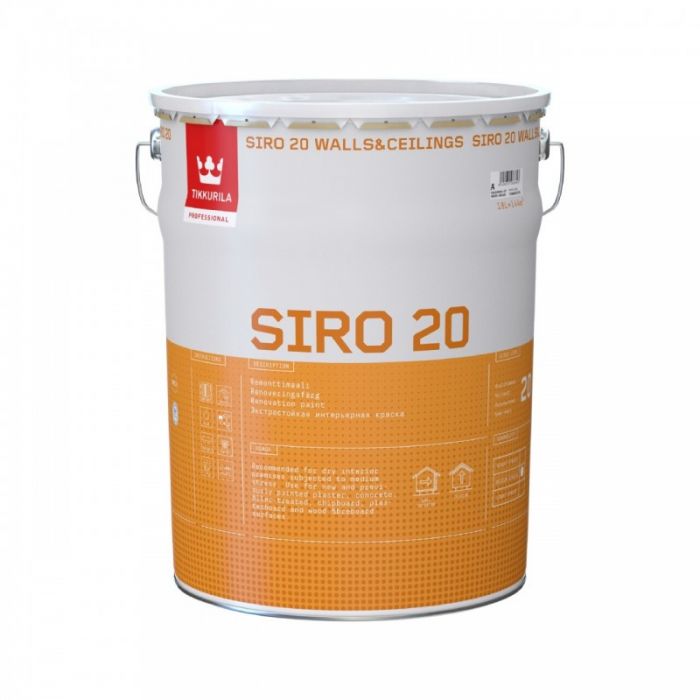 Siro 20 sopii betoni-, rappaus-, tasoite-, kipsilevy-, lastulevy- ja puukuitulevypintojen ensi- ja huoltomaalaukseen käyttöohjeen mukaan.