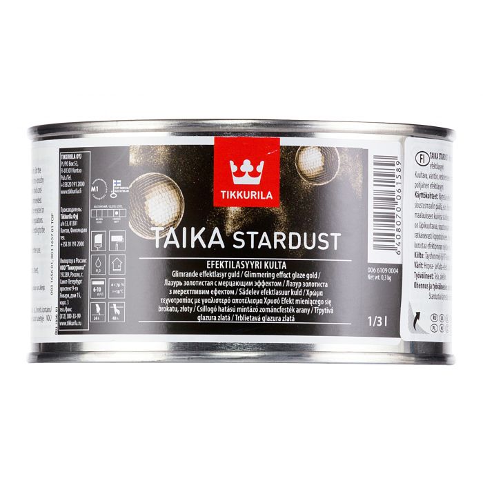 Taika Stardust on läpinäkyvä lasyyri. Käytettävän sisustusmaalin väri vaikuttaa ratkaisevasti lopputulokseen. Onko sinun valintasi viileän sininen seinä hopeahipuilla vai ehkä sacherin ruskea kultahipuilla? Vain luovuus on rajana!