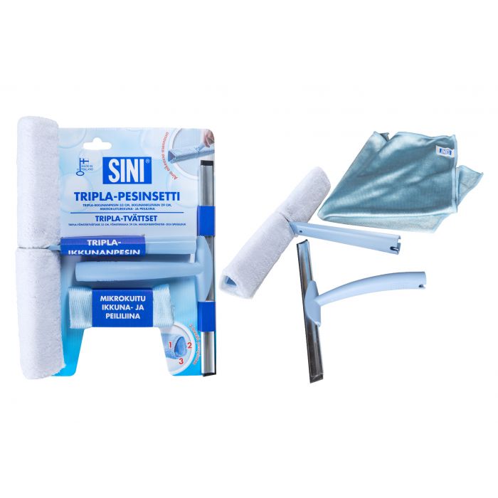 Pesusetti ikkunoiden pesuun ja puhdistukseen. Sisältää Tripla-ikkunanpesimen, Mikrokuituikkuna- ja peililiinan sekä 29 cm leveän kuivaimen. Tällä setillä pääset hyvään alkuun ikkunoiden pesemisessä.