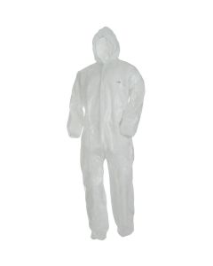 Valmistettu nonwoven materiaalista, jossa ohut mikrokalvo. Suojaa pölyltä/hiukkasilta ja rajoitetusti roiskeilta. Pehmeä, joustava ja ilmava. Huppu ja resorit vyötäröllä, hihoissa ja lahkeissa.
