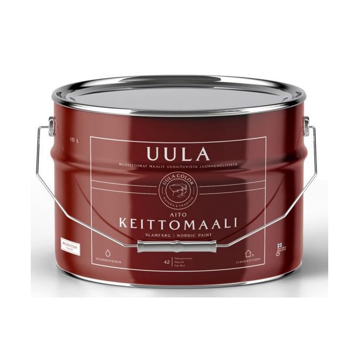 Uula Keittomaali on perinteisesti keittämällä valmistettu puna- tai keltamultamaali ulkokäyttöön. Helpposivelteinen ja kertamaalauksella peittävä. |