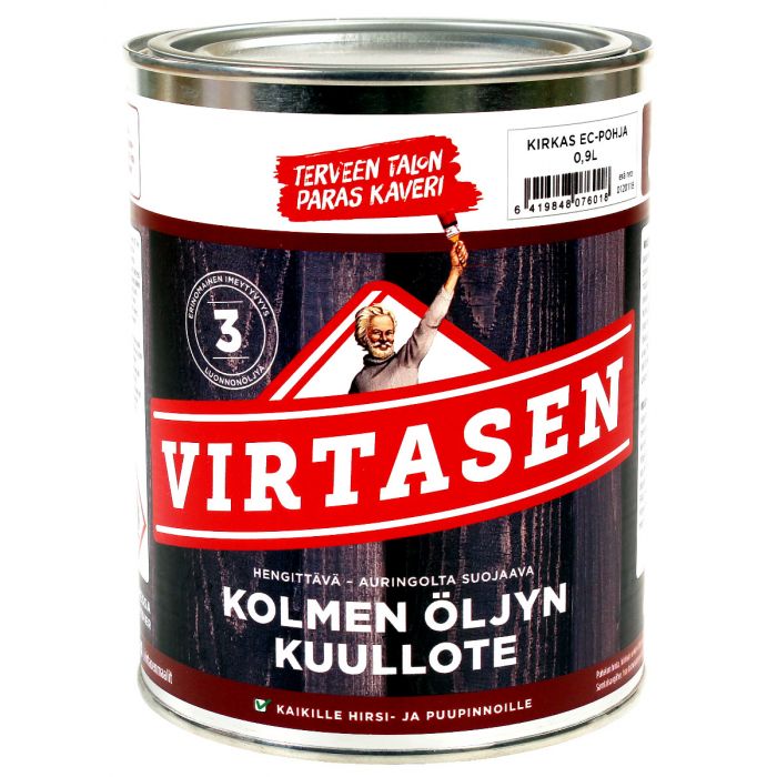 Kestävä Virtasen 3 Öljyn Kuullote on kehitetty erityisesti hirsirakennusten ja vastaavien kuultavaan pintakäsittelyyn. Tuote voidaan sävyttää kuullote- ja puuöljyvärikarttojen mukaan.