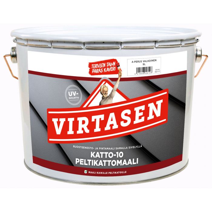 Peltikattomaali jossa on kaksi maalia yhdessä, ruosteenesto ja valmis pinta yhdellä sivelyllä Virtasen Katto-10 Peltikattomaali on kestävä perinteinen liuotinohenteinen uusien sekä vanhojen peltikattojen maali. Maali sisältää tehokasta ruosteenestopigmenttiä, joten erillistä ruosteenestopohjamaalia ei tarvita.