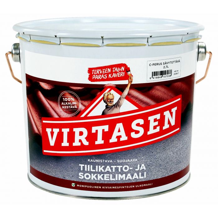 Virtasen Tiilikatto- ja Sokkelimaali on 100 % alkalinkestävä vesiohenteinen erikoisakrylaattimaali. Se sopii käytettäväksi kattotiilien ja betonisokkeleiden lisäksi myös sementtilaastilla tasoitetuille harkkosokkeleille sekä vastaaville kiviainespinnoille ulkona.