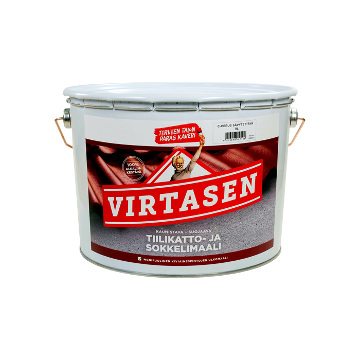 Virtasen Tiilikatto- ja Sokkelimaali on 100 % alkalinkestävä vesiohenteinen erikoisakrylaattimaali. Se sopii käytettäväksi kattotiilien ja betonisokkeleiden lisäksi myös sementtilaastilla tasoitetuille harkkosokkeleille sekä vastaaville kiviainespinnoille ulkona.